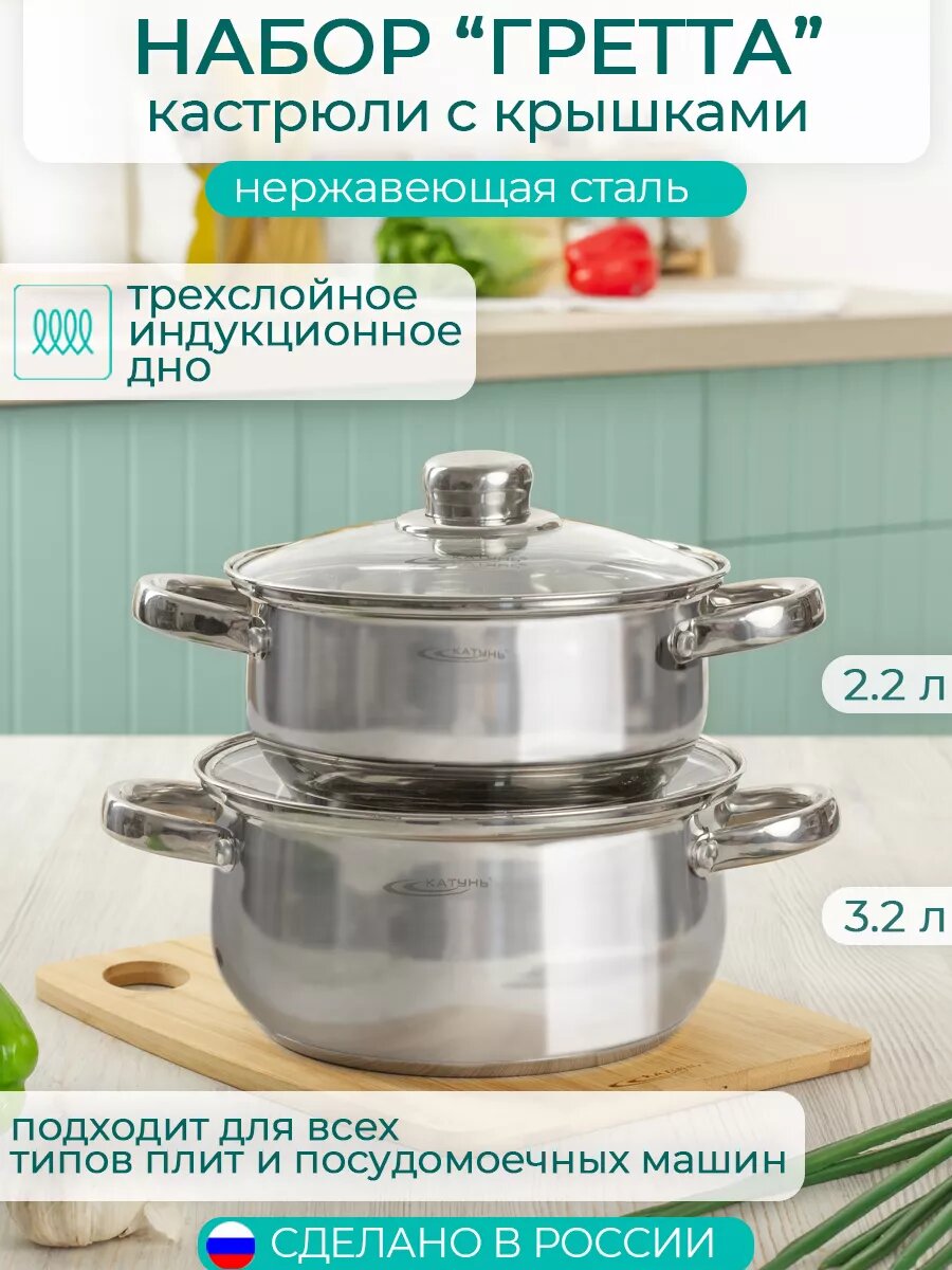 Набор кастрюль из нержавеющей стали "Гретта", 2 предмета: 2.2 л; 3.2 л, капсульное дно, индукция 3 611 ₽