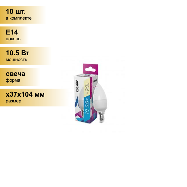 (10 шт.) Светодиодная лампочка Космос свеча E14 10,5W (10W) (840lm) 3000K 2K матов. 99x37 LkecLED10.5wCNE1430 . Цоколь E14 информация: