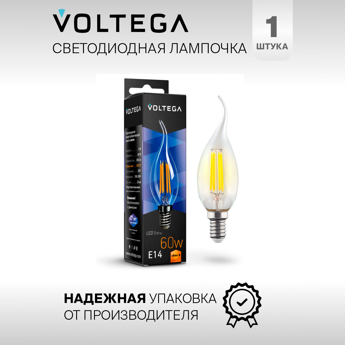 Отзывы на Лампочка светодиодная E14 форма свеча на ветру 6W теплый свет Voltega Crystal Candle 2800K 1 штука