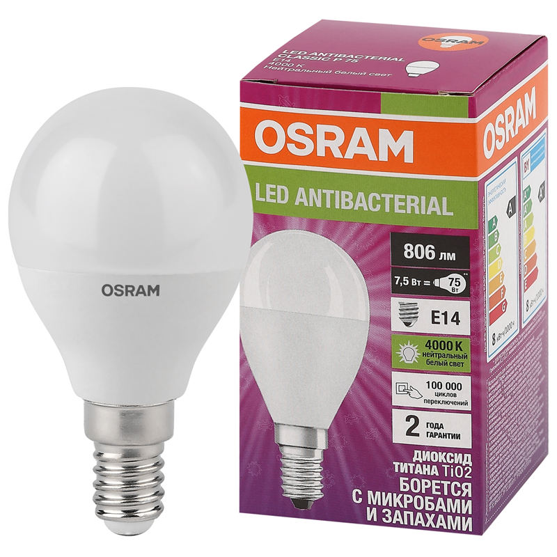 Лампа светодиодная OSRAM Antibacterial LCCLP60, E14, P45, 7.5 Вт, 4000 К информация: