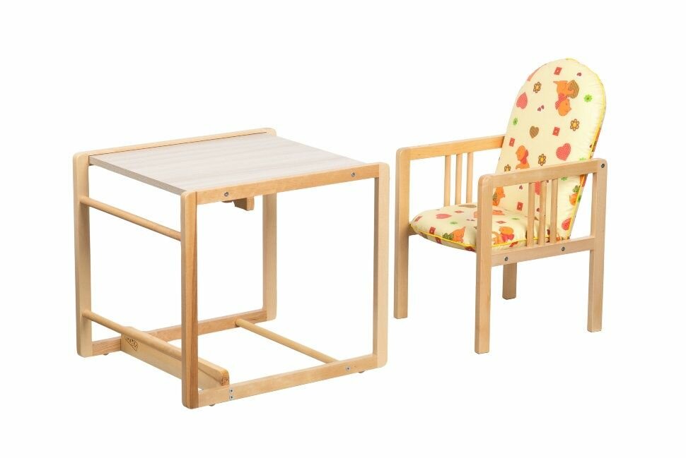 | Дополнительная информация | изготовлен из березы, покрытой лаком на водной основе; большая и малая столешницы сделаны из ламинированной ДСП; сиденье и спинка обиты прочной водоотталкивающей тканью; в качестве отдельного стула может использоваться до 6 лет |