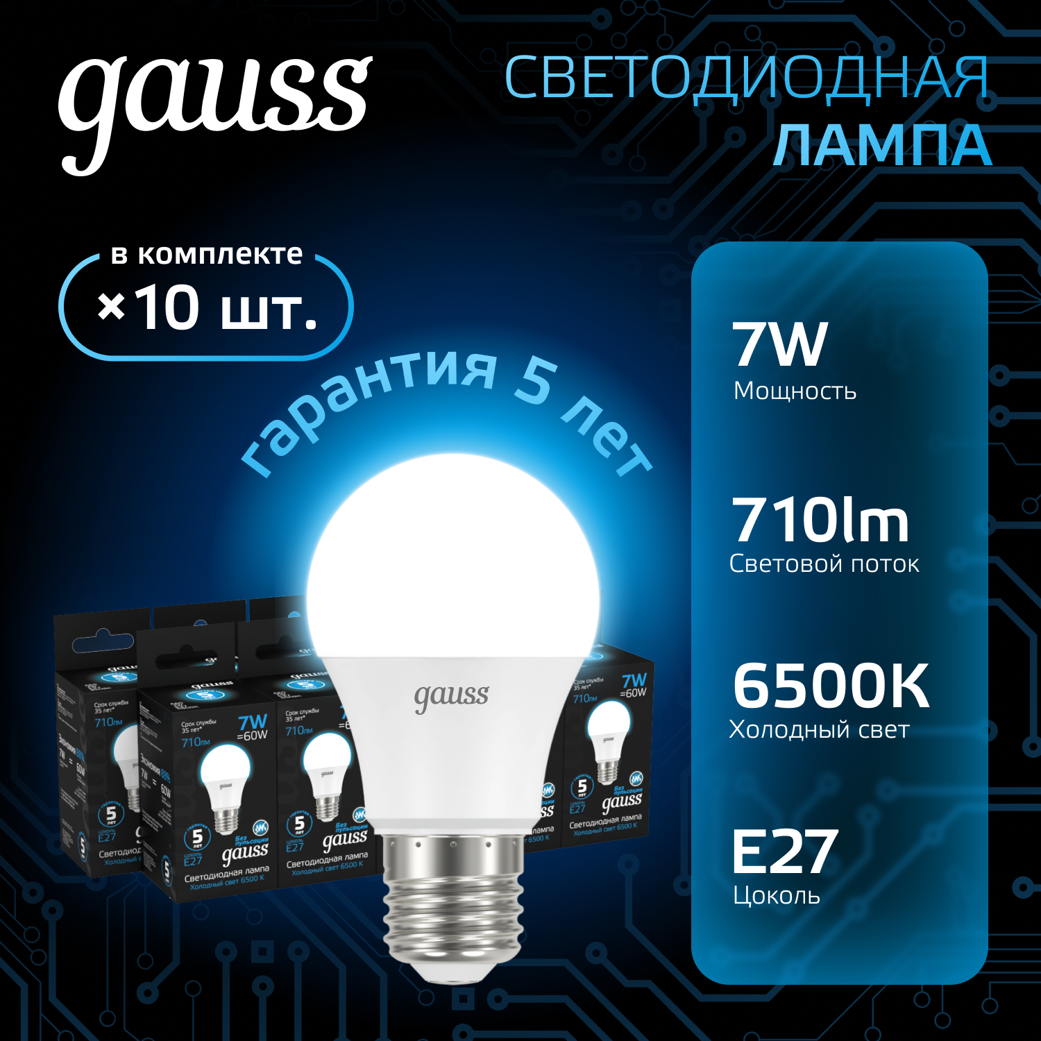 Лампочка светодиодная Е27 Груша 7W холодный свет 6500К упаковка 10 шт. Gauss Black информация: