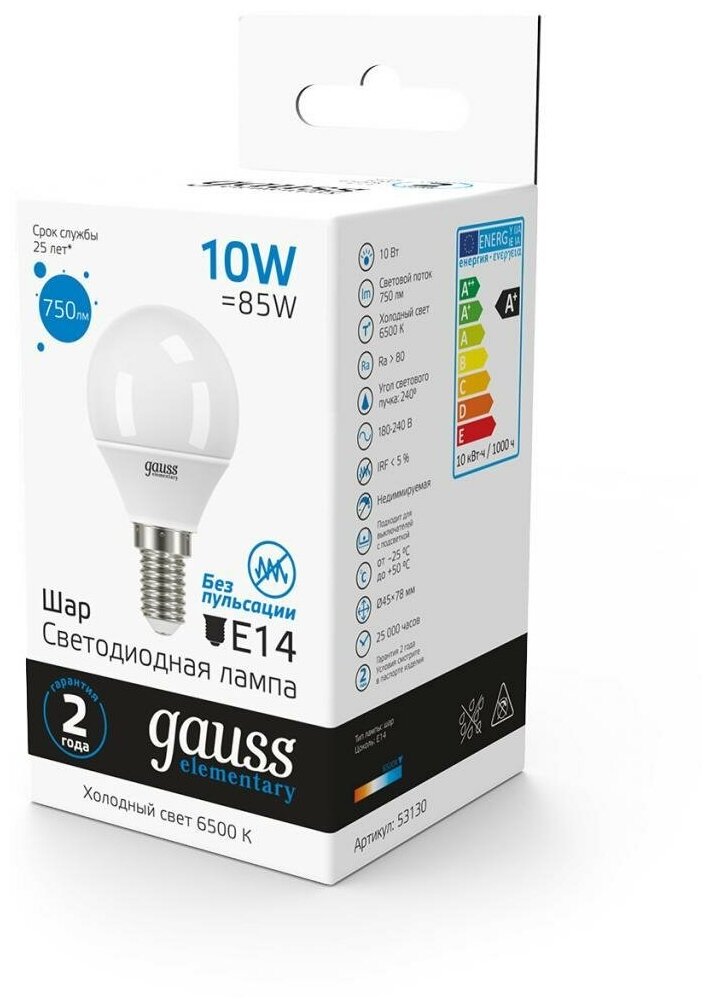 Лампа GAUSS Elementary Шар 10W 750lm 6500K Е14 LED 1/10/100 53130