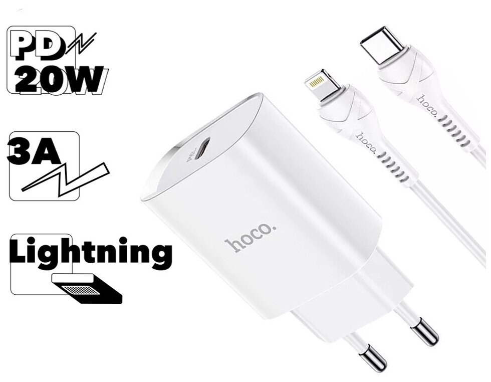 Сетевое зарядное устройство, 1 PD 20W, 3.0 QC (N14), HOCO, Type-C to Lightning, Умная зарядка, белый 918 ₽