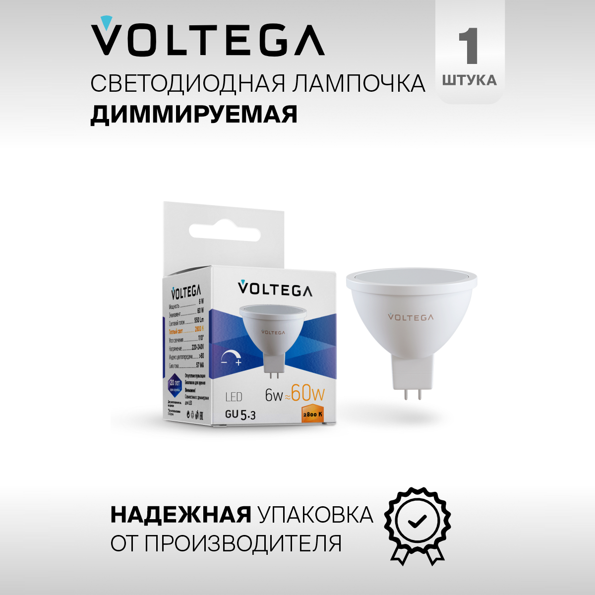 Отзывы на Лампочка светодиодная GU5.3 форма софит 6W теплый свет Voltega Simple MR16 2800K 1 штука диммируемая