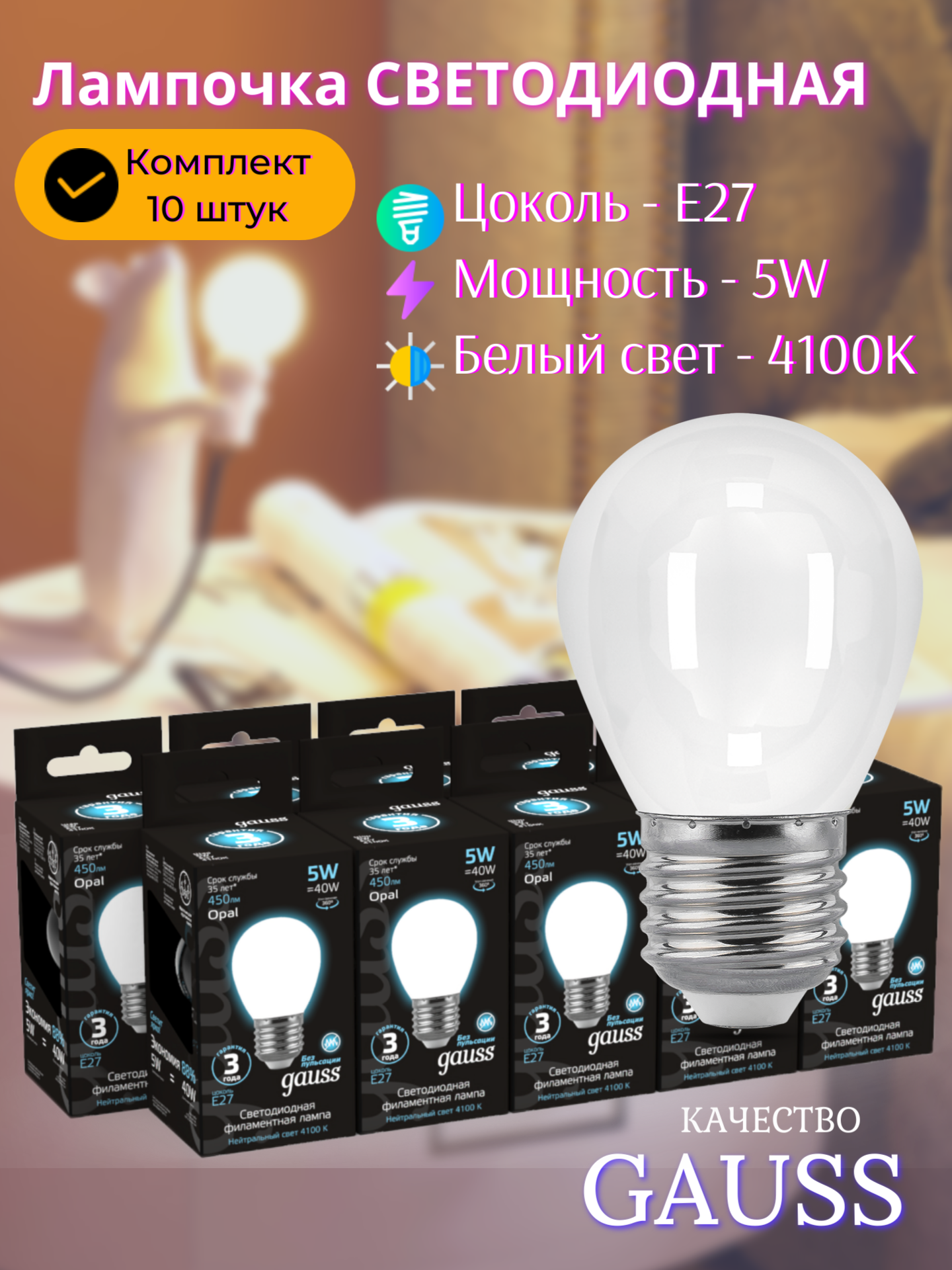 (10 шт.) Светодиодная лампочка Gauss Filament Шар G45 E27 5W(450lm) 4100K 4K матов. 80x45 филамент (нитевидная), 105202205