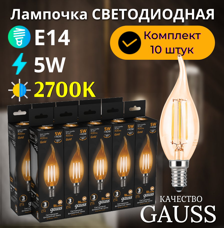 Отзывы на Лампочка светодиодная E14 Свеча на ветру 5W теплый свет 2700K Gold упаковка 10 шт. Gauss Black Filament