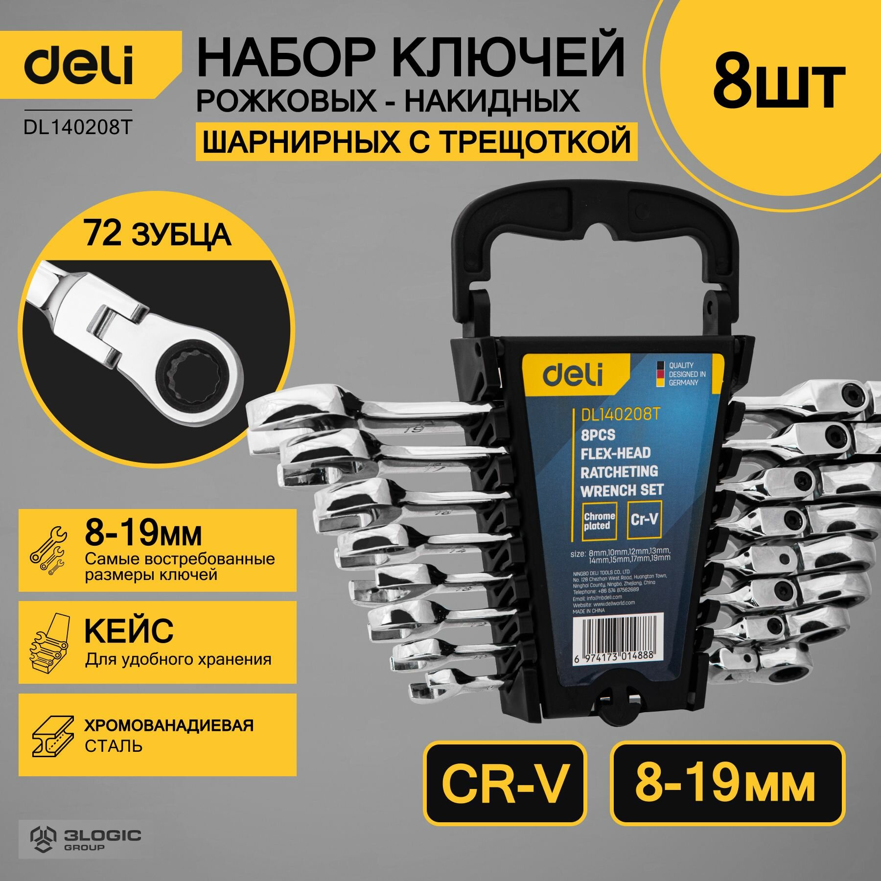 Набор комбинированных шарнирных ключей с трещоткой 8 шт Deli DL140208T Cr-V, 8-19мм информация: