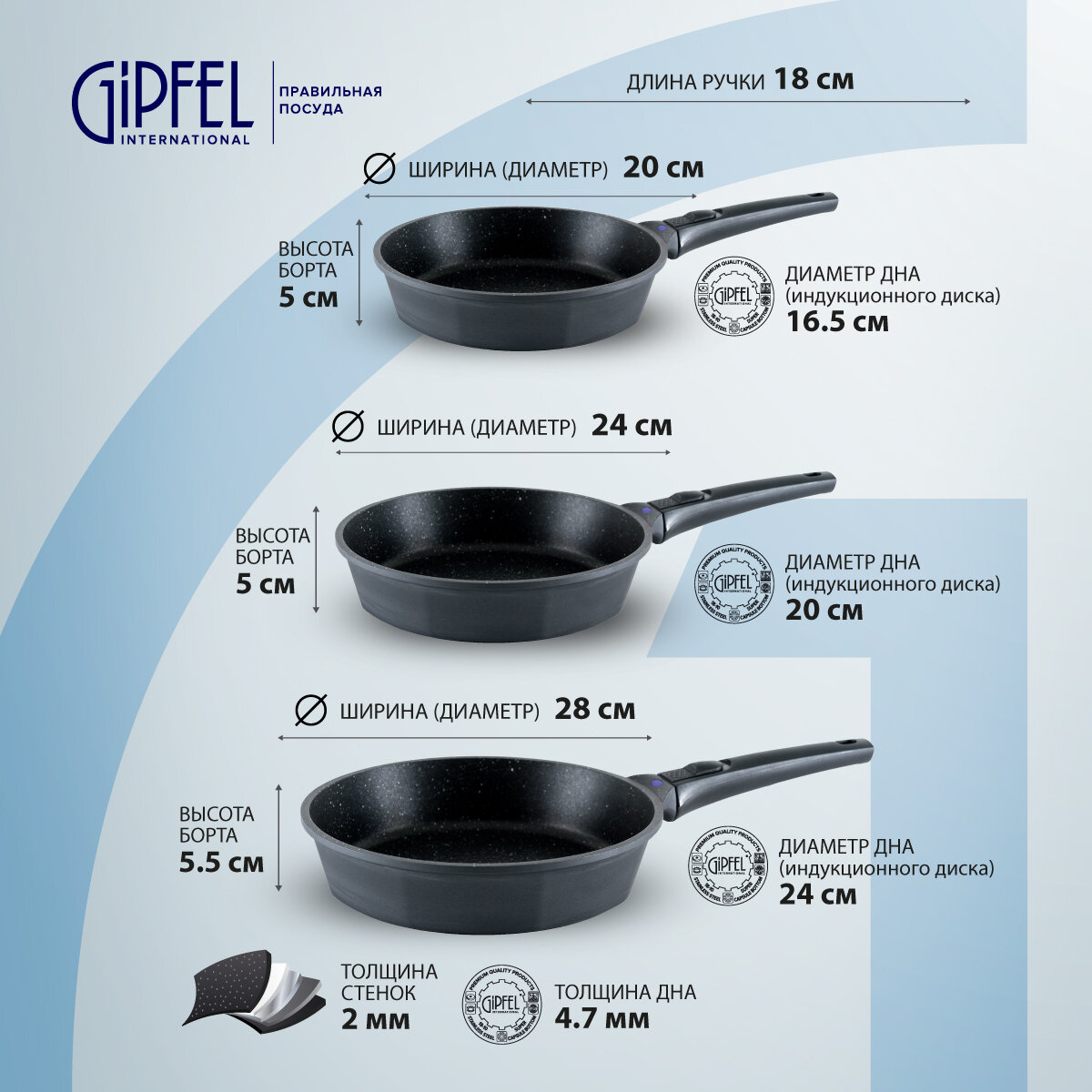 | Комплектация | сковороды: 20 см, 24 см, 28 см; съемная ручка |