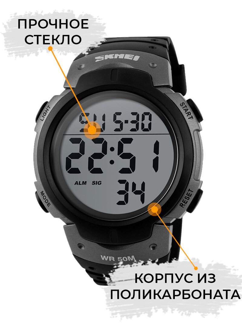 Часы наручные мужские электронные спортивные SKMEI водонепроницаемые, с будильником и секундомером, черные/серебристые информация: