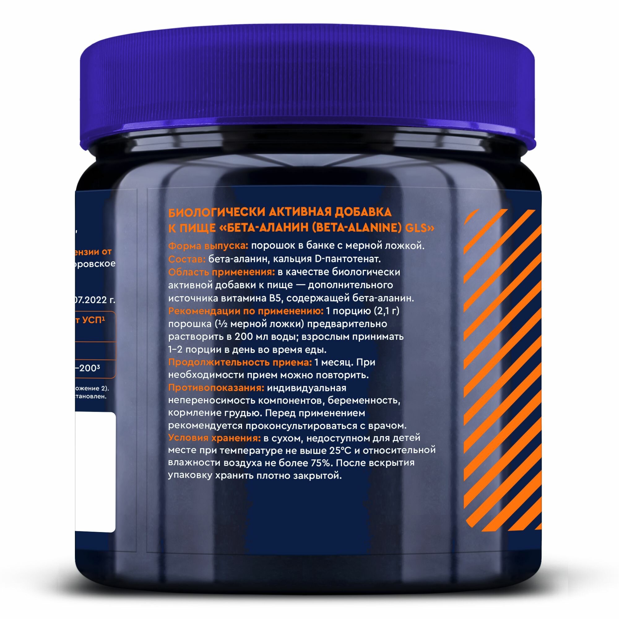 | Дополнительная информация | размер порции в г(мл): 2.1; назначение: в качестве биологически активной добавки к пище – дополнительного источника витамина В5, содержащей бета-аланин.; рекомендации по применению: 1 порцию (2,1 г) порошка (½ мерной ложки) предварительно растворить в 200 мл воды; взрослым принимать 1-2 порции в день во время еды.; состав: 2,1 – 4,2 г порошка содержат: Бета-Аланин — 2000 - 4000 мг. Витамин В5 — 6 - 12 мг. |