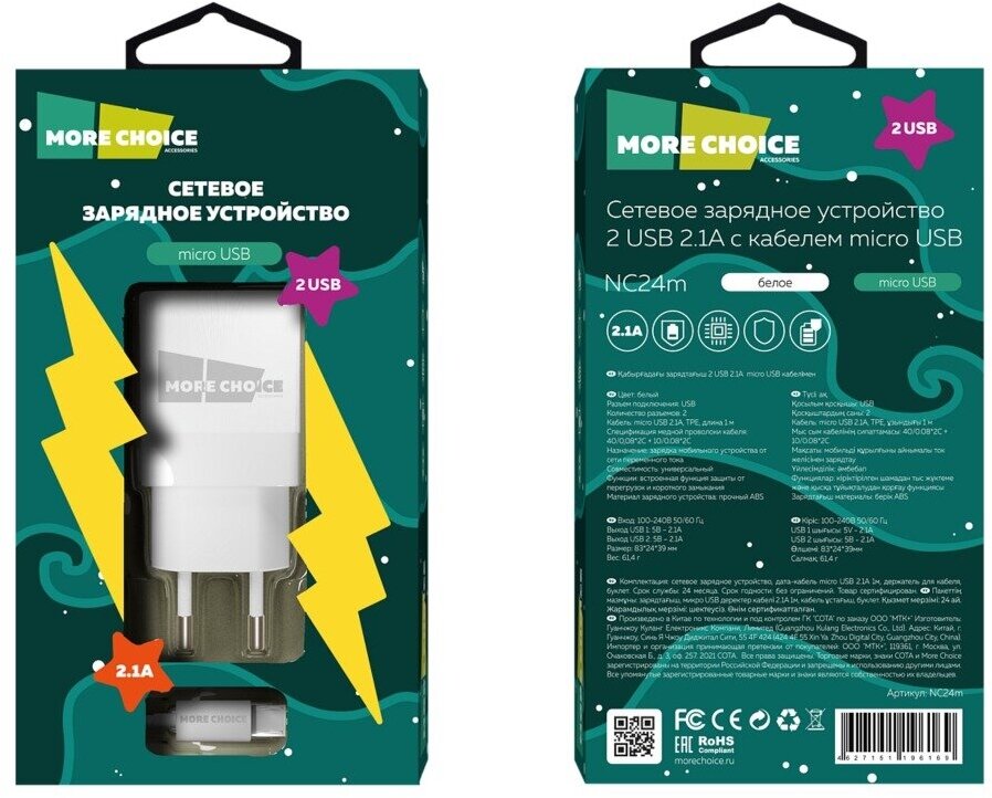 Отзывы на Устройство зарядное сетевое More Choice NC24m, 2USB, 2.1A, с кабелем micro USB, длина: 1м, цвет: белый