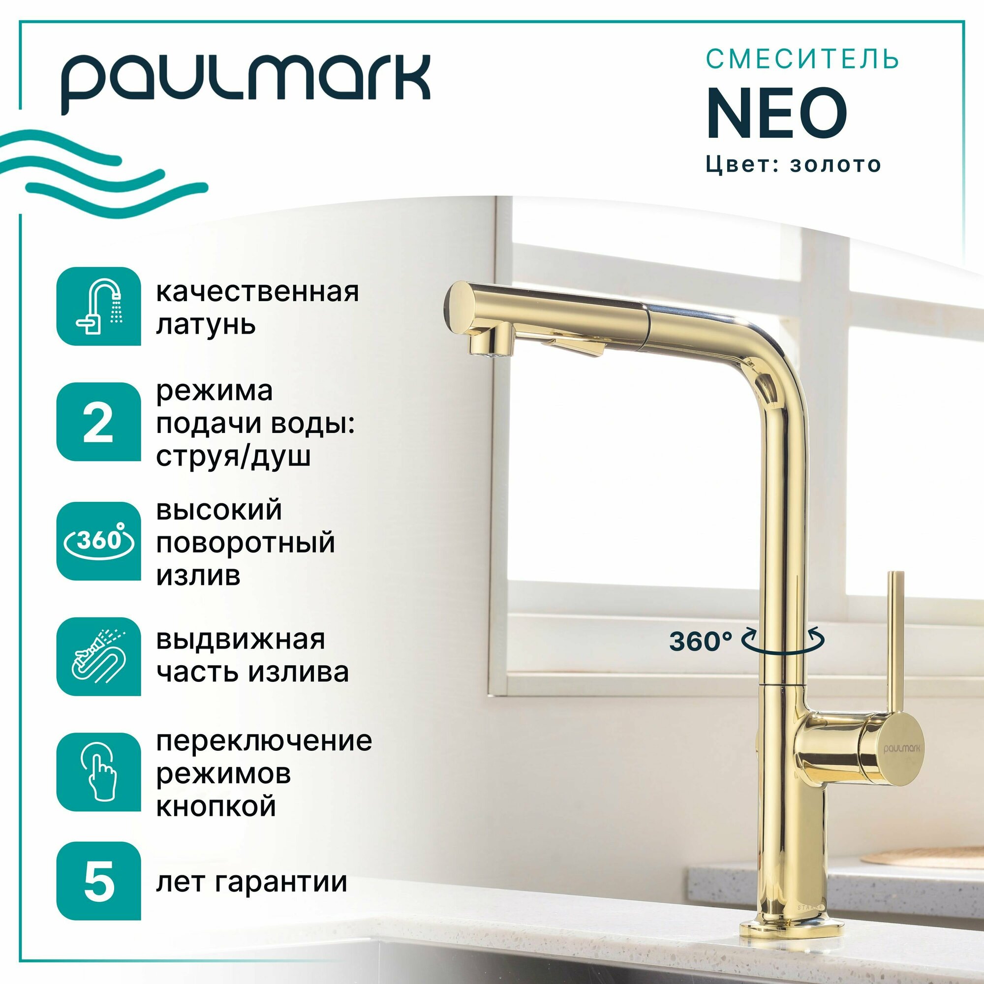 Отзывы на Смеситель для кухни с гибким выдвижным изливом Paulmark-Starke NEO, высокий поворотный излив, режимы струя / душ, однорычажный, латунь, на мойку / столешницу, золото, Ne214419-G