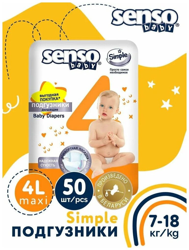 Подгузники детские для детей Senso Baby Simple размер 4L (7-18 кг) 50 шт. информация: