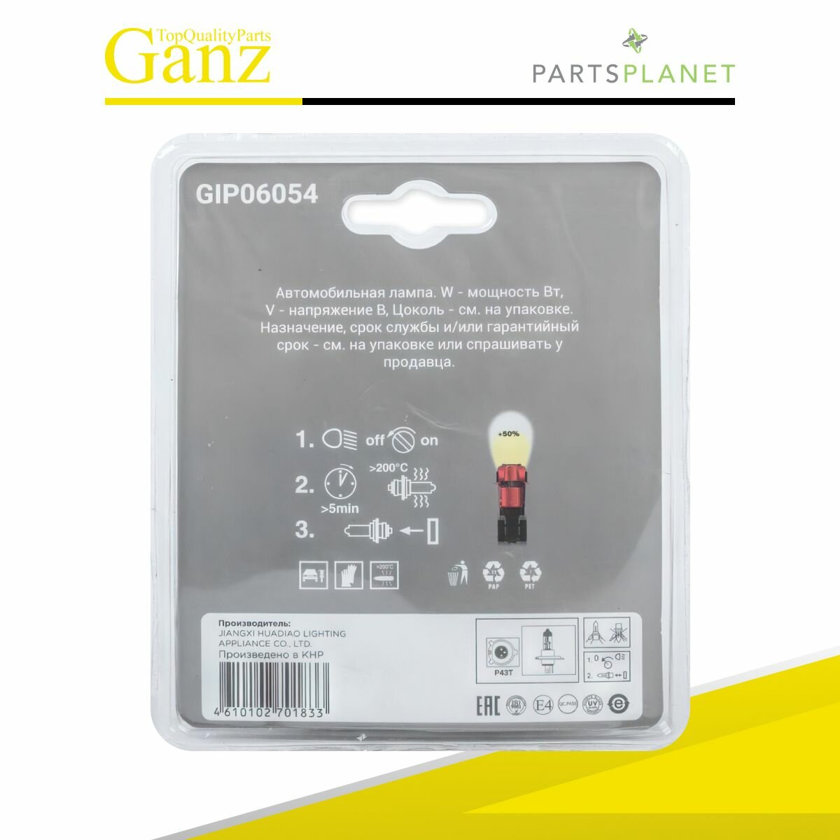 Лампа 12V H4 100/90W +50% P43t 5000K Ganz 2 Шт. Блистер Gip06054 GANZ арт. GIP06054