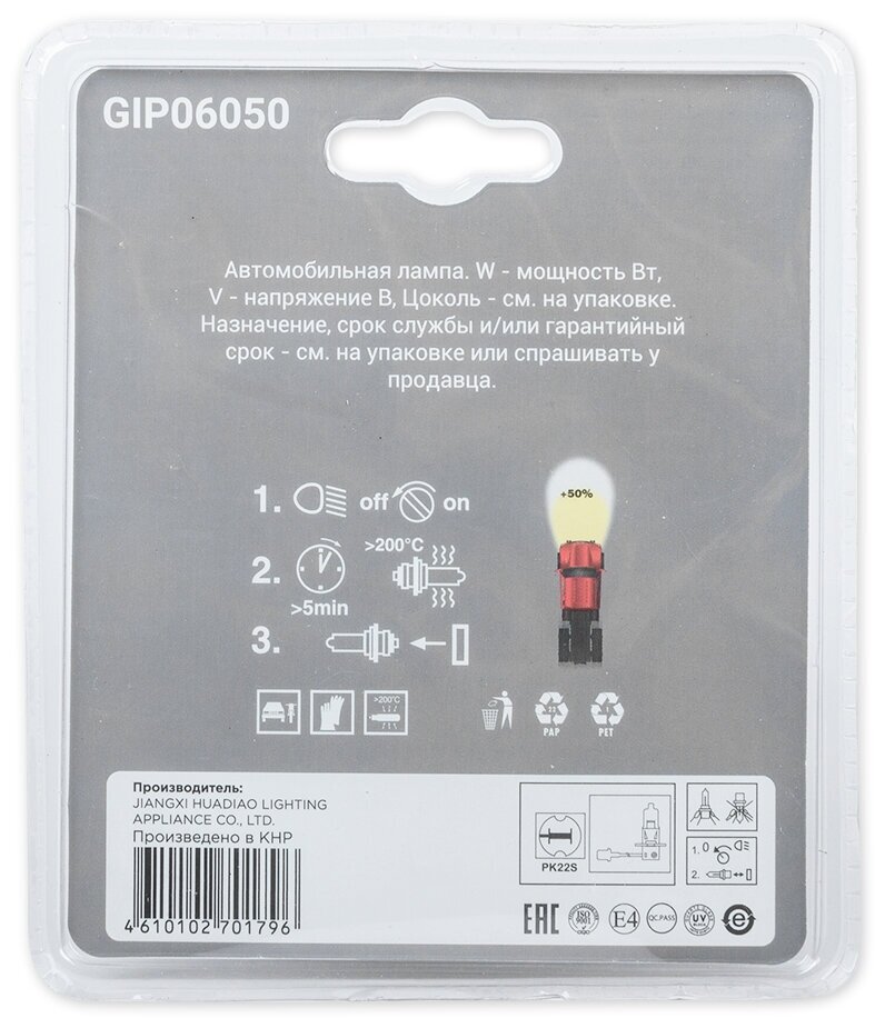 Лампа 12V H3 55W +50% PK22s 5000K GANZ 2 шт. блистер GIP06050 информация: