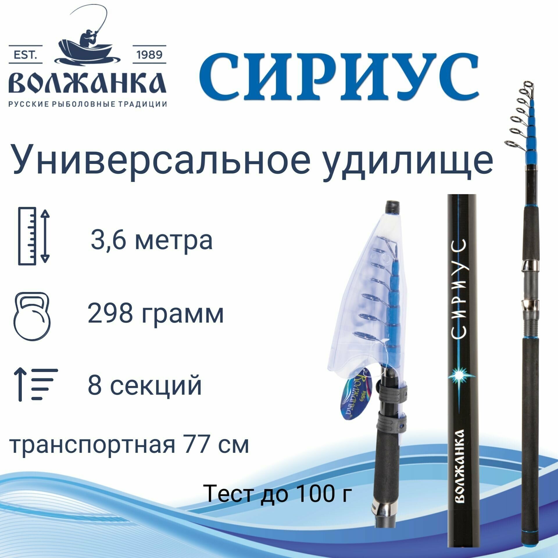 Удилище универсальное "Волжанка Сириус" 3.6м тест до 100гр (8 секций)