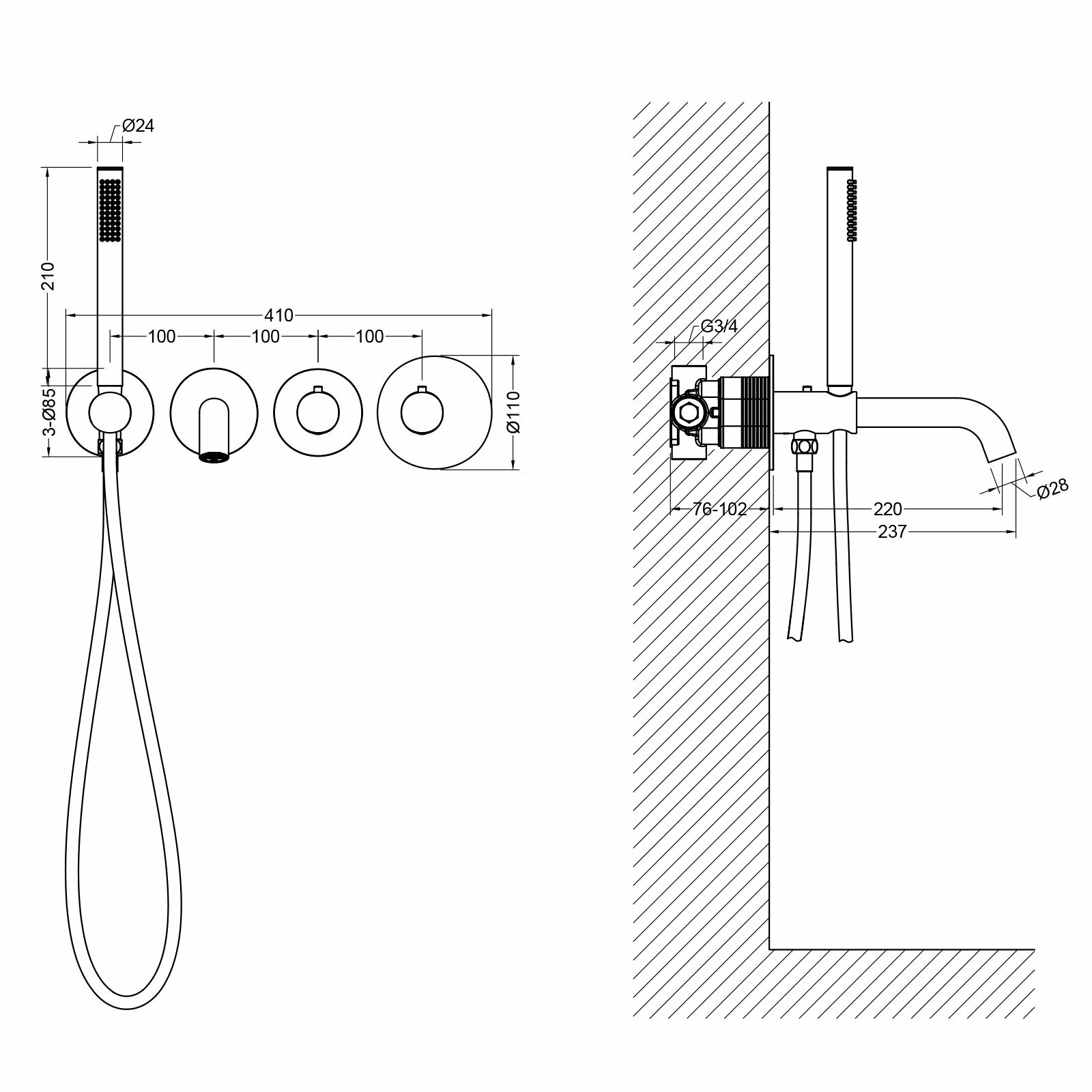 Смеситель для ванны Orange ALFI двухвентильный с душевым набором, глянцевый хром