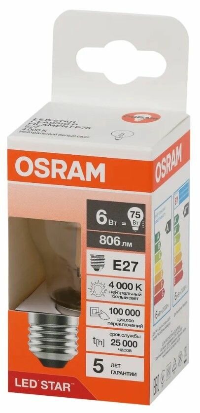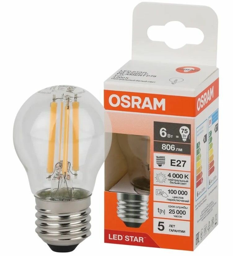 Отзывы на Лампа LED Шарик 6Вт 220-240В E27 806Лм 4000К Угол 300 град. d 45mm h 77mm Филаментная Стекло Свет Дневной белый Osram, уп. 5шт