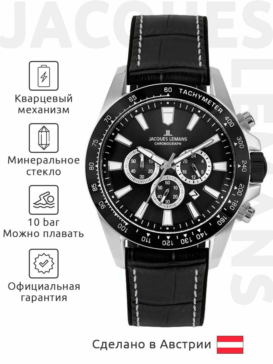 Наручные часы Jacques Lemans 1-2140B, мужские кварцевые спортивные часы Жак Леман с хронографом и датой на комбинированном ремне (силикон и кожа) 30 860 ₽
