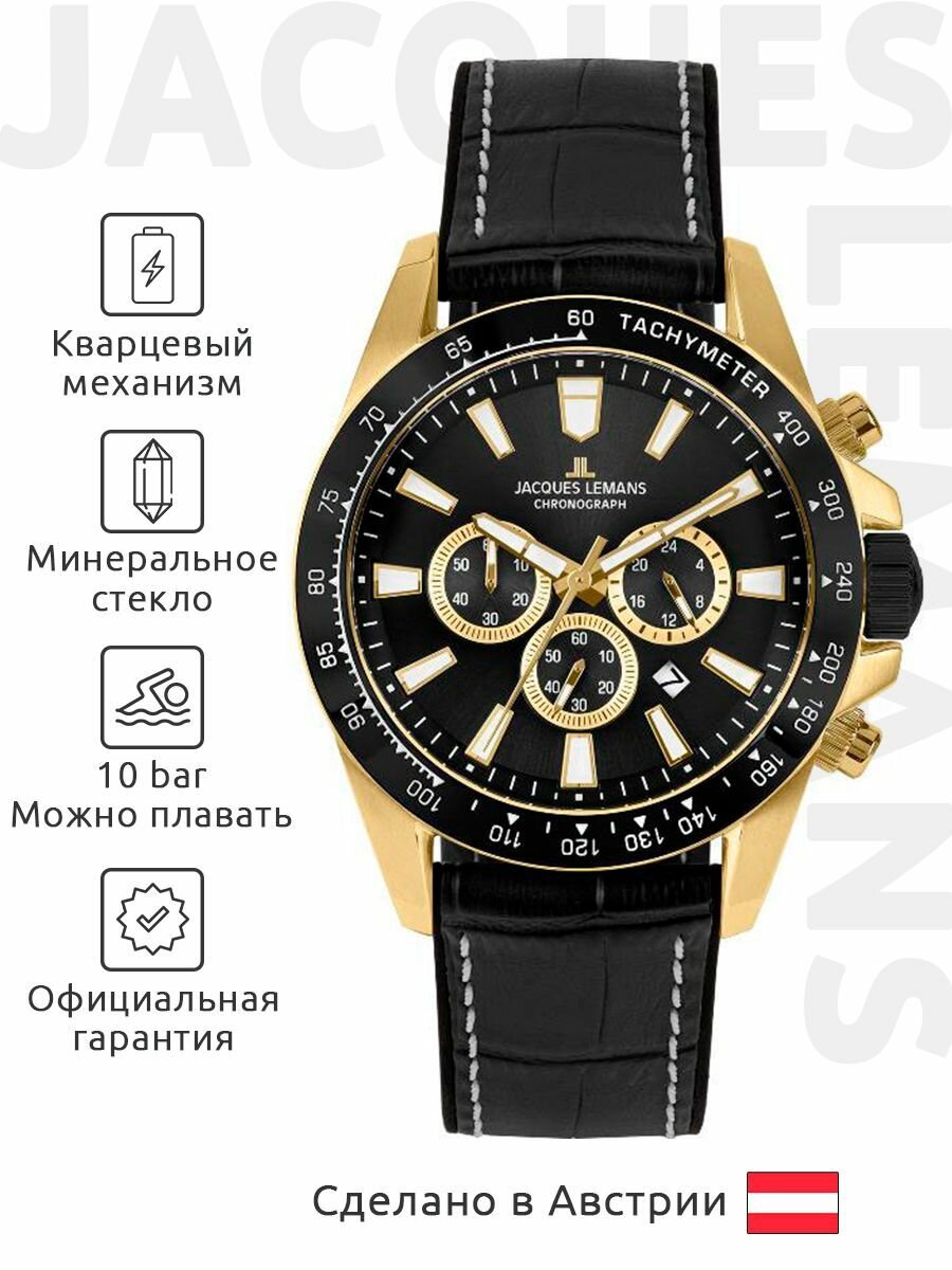 Наручные часы Jacques Lemans 1-2140B, мужские кварцевые спортивные часы Жак Леман с хронографом и датой на комбинированном ремне (силикон и кожа) 30 860 ₽