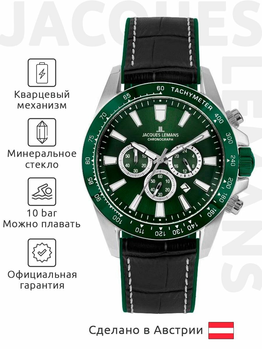 Наручные часы Jacques Lemans 1-2140C, мужские кварцевые спортивные часы Жак Леман с хронографом и датой на комбинированном ремне (силикон и кожа)