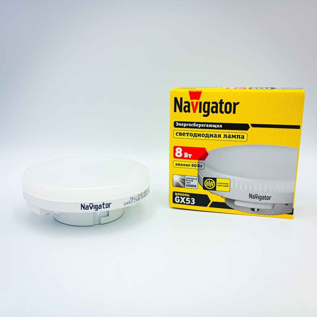 (1 шт.) Светодиодная лампочка Navigator, мощность 8 Вт, напряжение питания 220 В, цветовая температура 4000 К, нейтральный белый свет, цоколь GX53, таблетка, размер 74х28 мм