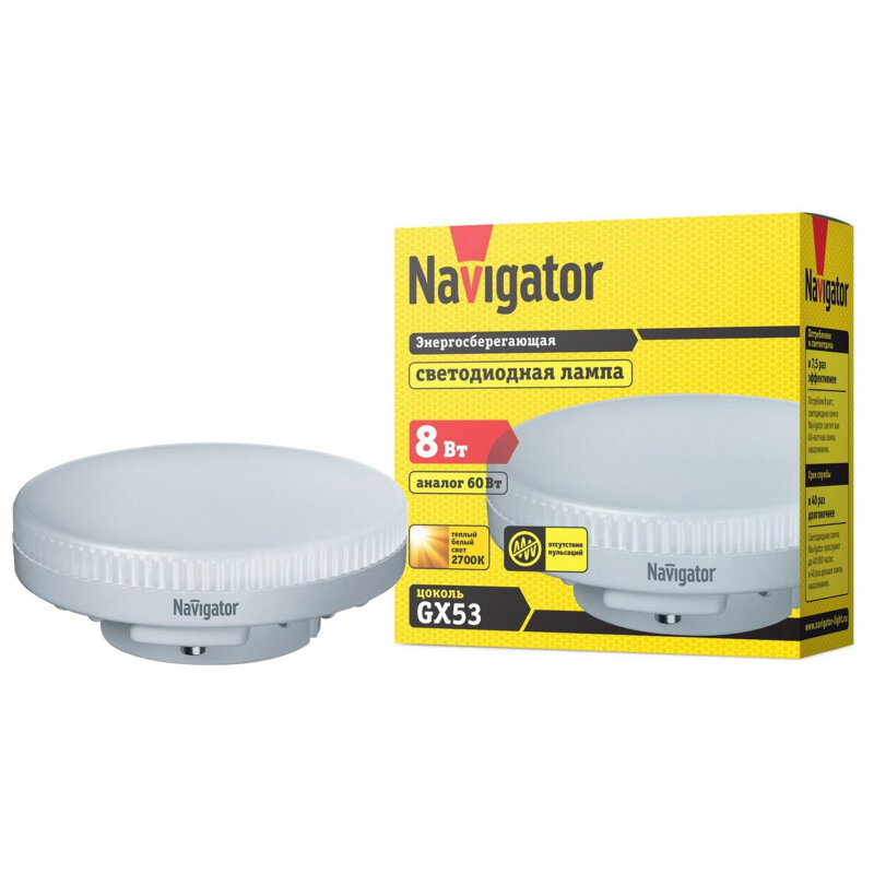 (1 шт.) Светодиодная лампочка Navigator, мощность 8 Вт, напряжение питания 220 В, цветовая температура 4000 К, нейтральный белый свет, цоколь GX53, таблетка, размер 74х28 мм