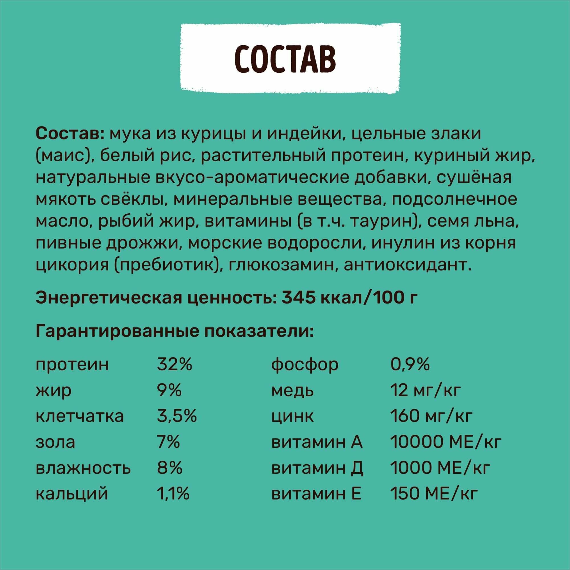 | Состав | мука из курицы и индейки, цельные злаки (маис), белый рис, растительный протеин, куриный жир, натуральные вкусо-ароматические добавки, сушёная мякоть свёклы, минеральные вещества, подсолнечное масло, рыбий жир, витамины (в т.ч. таурин), семя льна, пивные дрожжи, морские водоросли, инулин из корня цикория (пребиотик), глюкозамин, антиоксидант |
