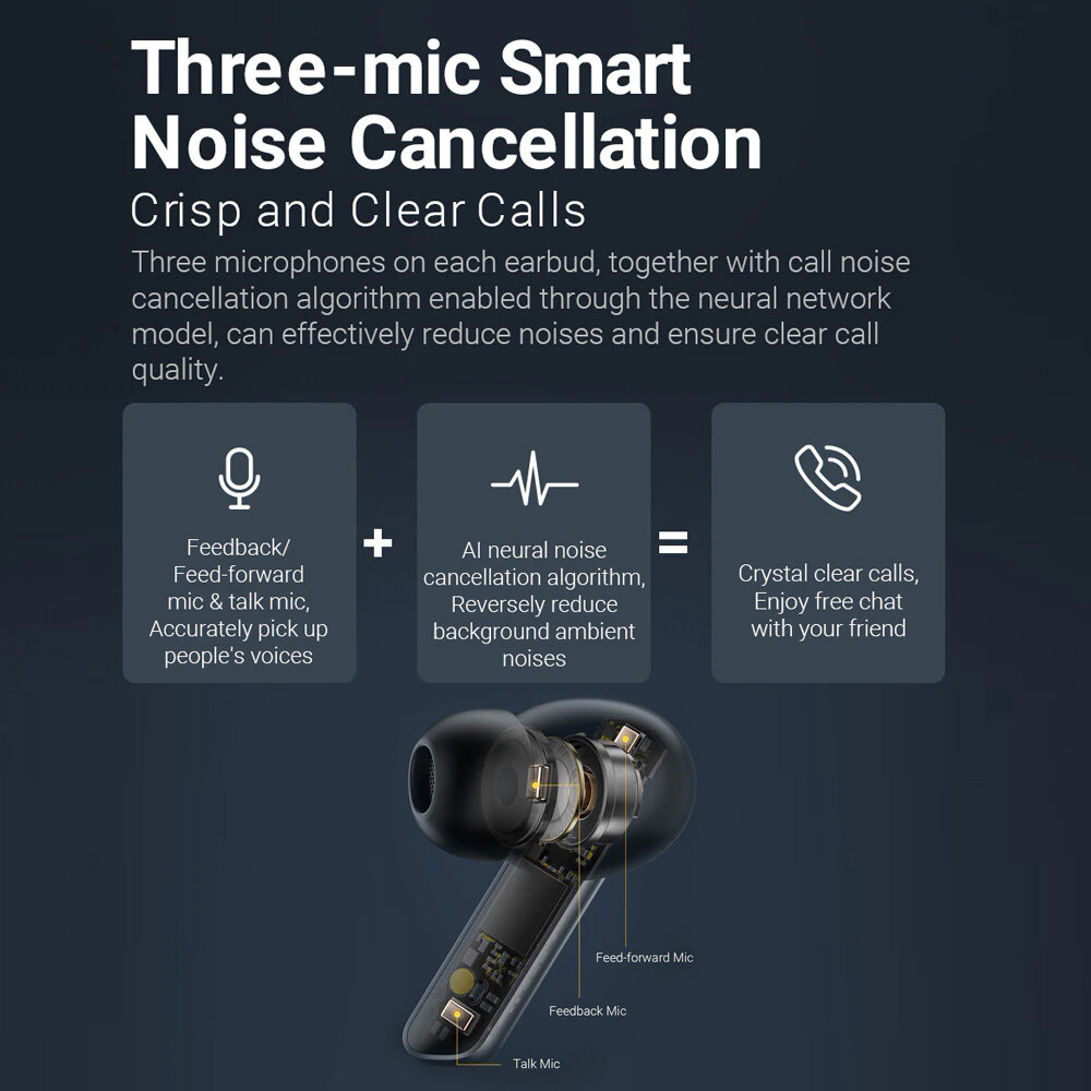 | Дополнительная информация | оснащен тремя микрофонами на каждом наушнике; совместимость с системами Android / iOS; поддерживаемые протоколы A2DP / AVRCP / HFP; время работы 40 ч ANC OFF (наушники 9 ч +зарядный кейс 31 ч), 22 ч ANC ON (наушники 5 ч + зарядный кейс 17 ч) |