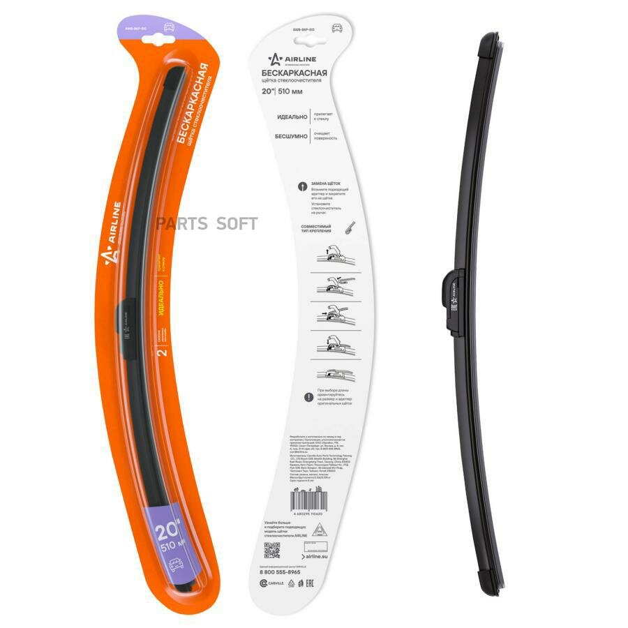 Щетка стеклоочистителя 500мм (20') бескаркасная, 1 адаптер (Hook 9x3, 9x4 mm - Крючок 9x3, 9x4 мм) (AWB-BKP-510) AIRLINE 427 ₽