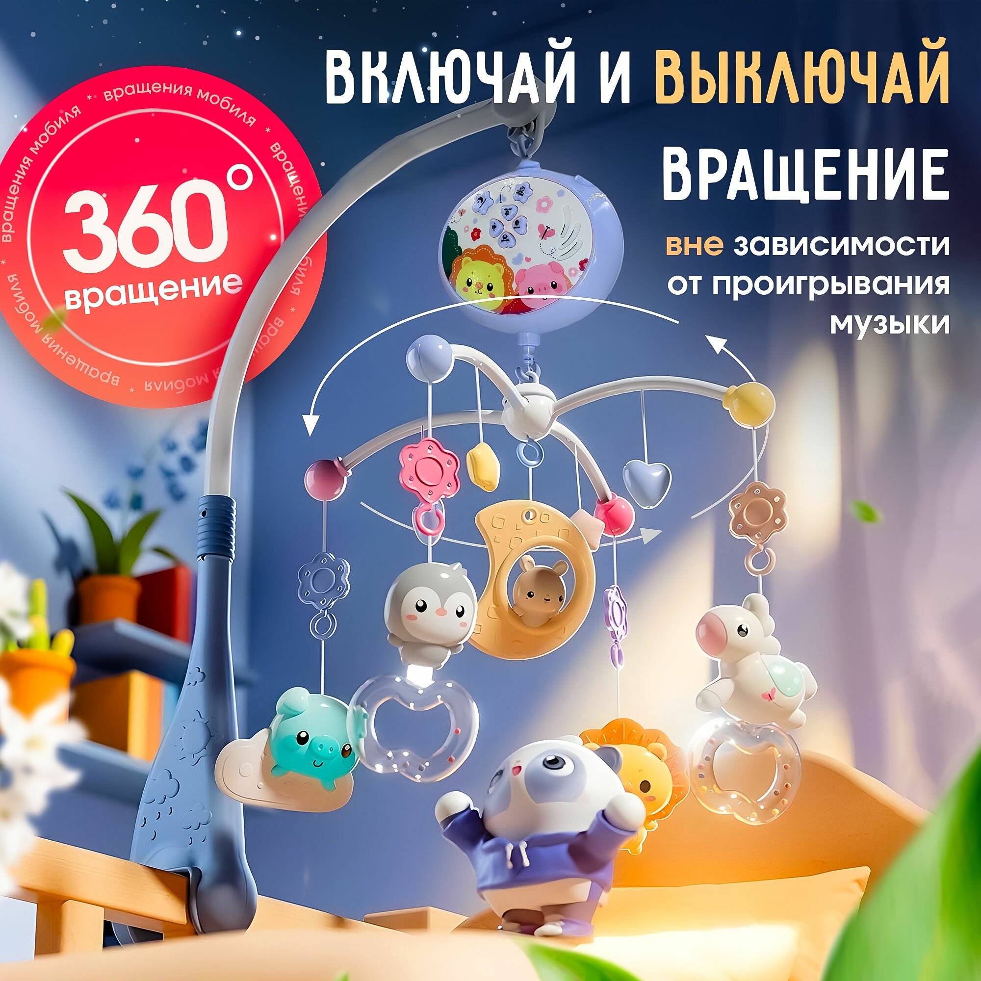 | Особенности | вращение игрушек / звуки природы / звуковые эффекты / проектор / пульт ДУ / регулировка громкости / световые эффекты |
