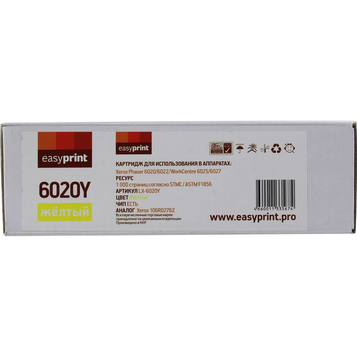 Тонер-картридж EasyPrint для Xerox Phaser 6020, 6022, WorkCentre 6025, 6027 1000 страниц желтый, с чипом 106R02762 LX-6020Y информация: