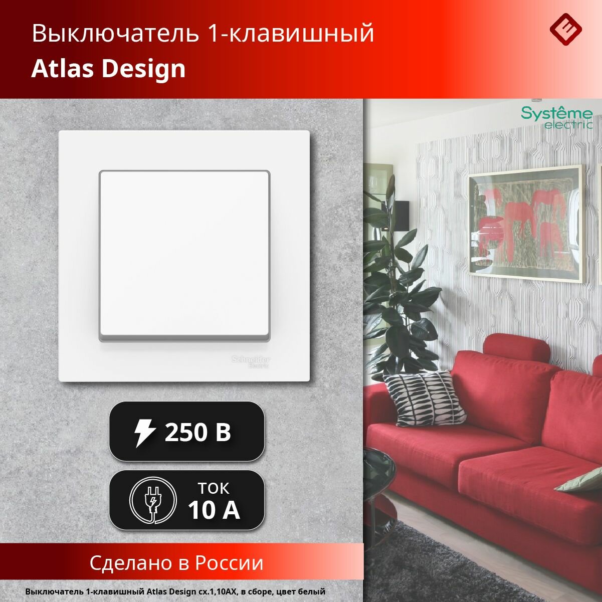 Выключатель 1-клавишный Systeme (Schneider) Electric Atlasdesign, встраиваемый, в сборе, белый 200 ₽