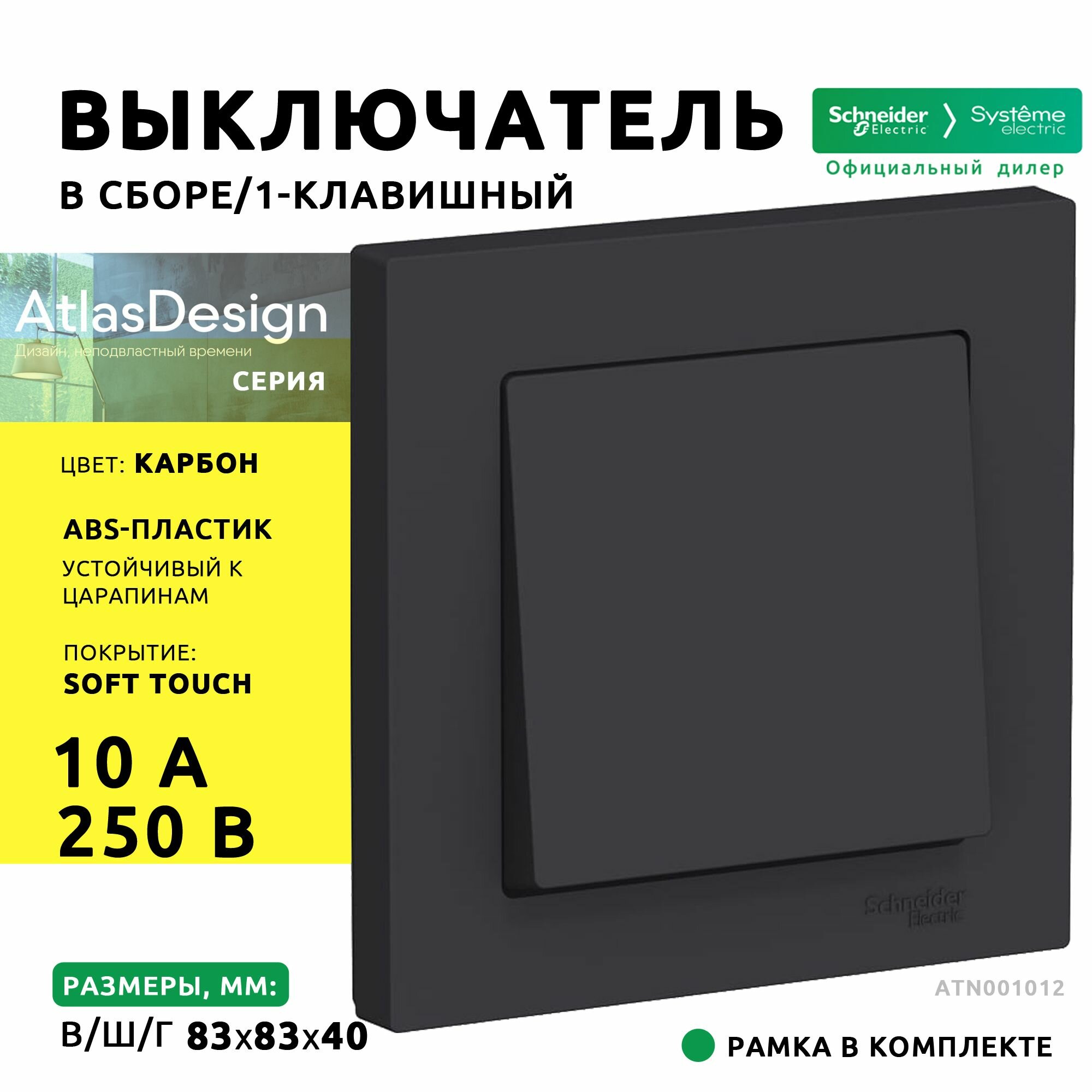 Выключатель 1-клавишный Systeme Electric/Schneider Electric AtlasDesign 10А скрытой установки в сборе карбон ATN001012 информация: