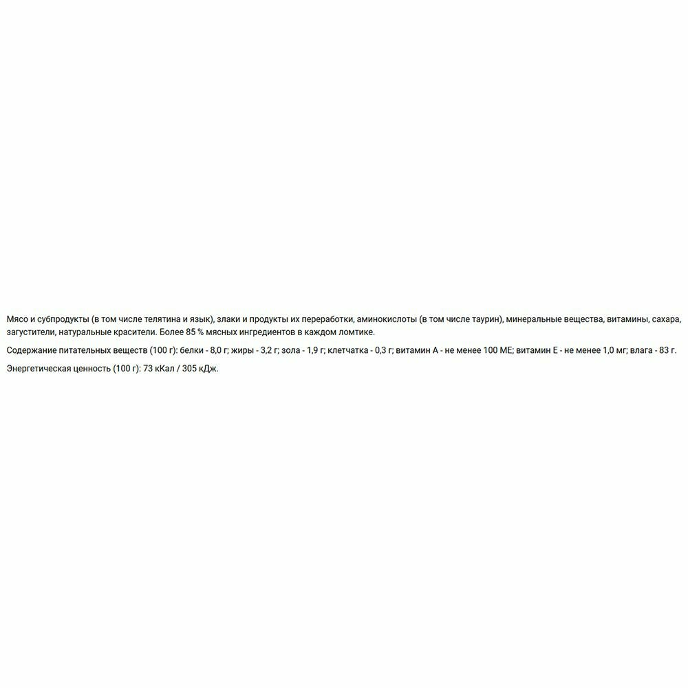 | Состав | мясо и субпродукты (в том числе курица и индейка), злаки и продукты их переработки, аминокислоты (в том числе таурин), минеральные вещества, витамины. Более 85% мясных ингредиентов в каждом ломтике |