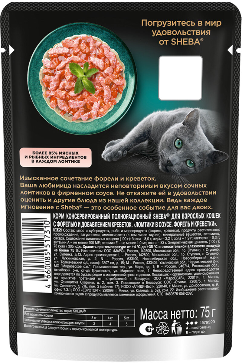 SHEBA для взрослых кошек ломтики в соусе с форелью и креветками пауч 75 гр х 5 шт информация: