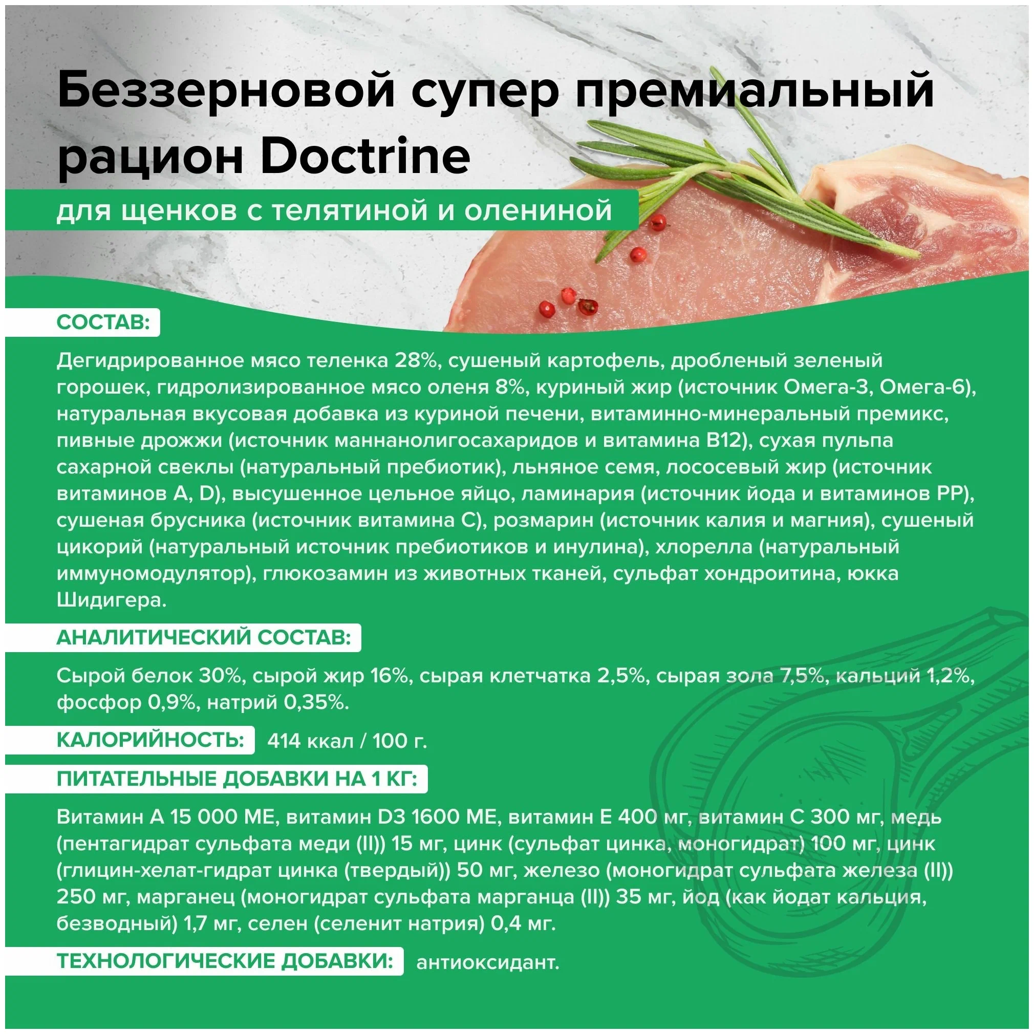 | Состав | дегидрированное мясо теленка 28%, сушеный картофель, дробленый зеленый горошек, гидролизированное мясо оленя 8%, куриный жир (источник Омега-3, Омега-6), натуральная вкусовая добавка из куриной печени, витаминно-минеральный премикс, пивные дрожжи (источник маннанолигосахаридов и витамина В12), сухая пульпа сахарной свеклы (натуральный пребиотик), льняное семя, лососевый жир (источник витаминов А, D), высушенное цельное яйцо, ламинария (источник йода и витаминов РР), сушеная брусника (источник витамина С), розмарин (источник калия и магния), сушеный цикорий (натуральный источник пребиотиков и инулина), хлорелла (натуральный иммуномодулятор), глюкозамин из животных тканей, сульфат хондроитина, юкка Шидигера |