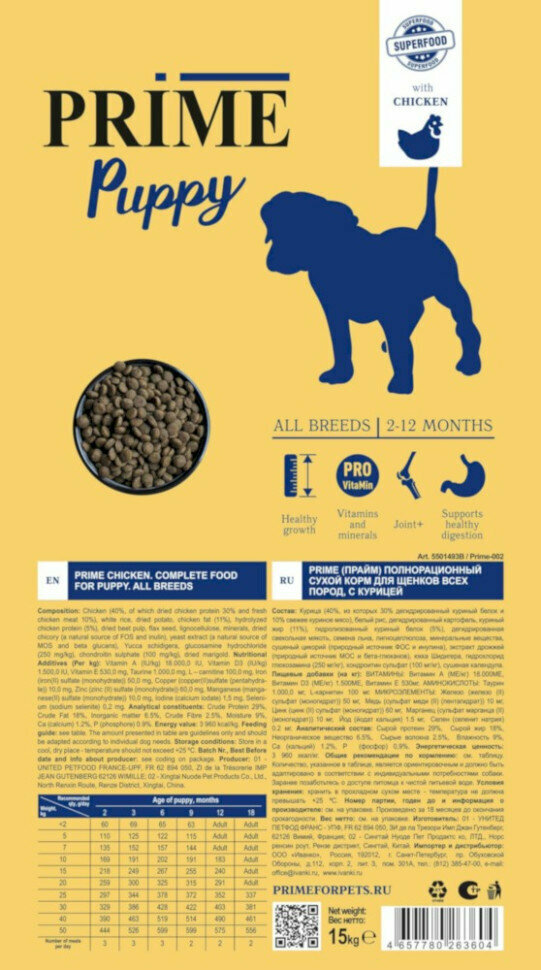 Prime Puppy сухой корм для щенков всех пород с 2 до 12 месяцев, с курицей - 15 кг информация:
