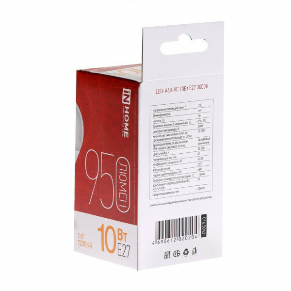 Энергоком Лампа светодиодная LED-A60-VC 10Вт 230В Е27 3000К 900Лм In Home информация: