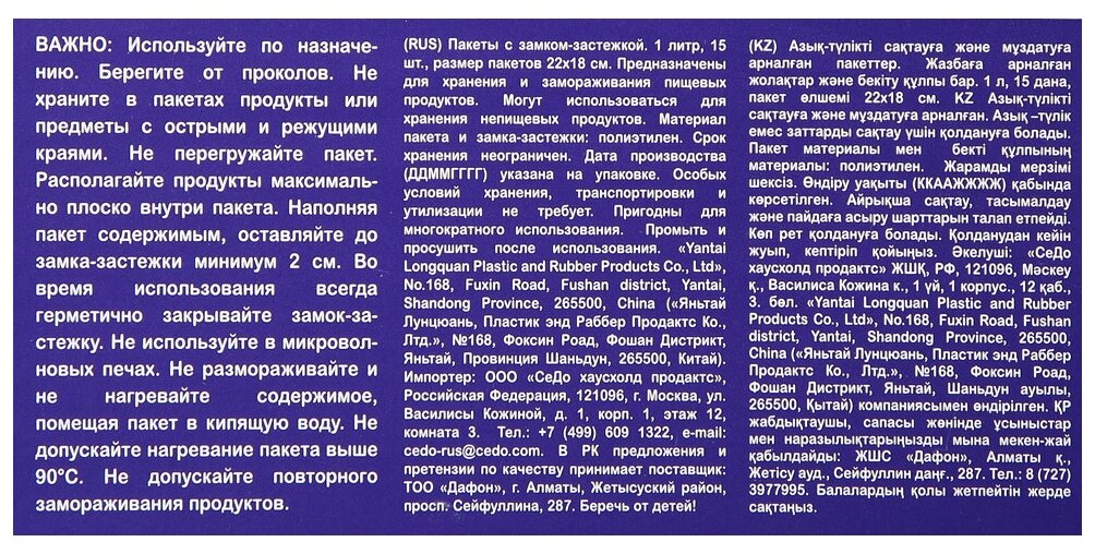 Пакеты с замком-застежкой 22х18см, 1л, 15шт. информация: