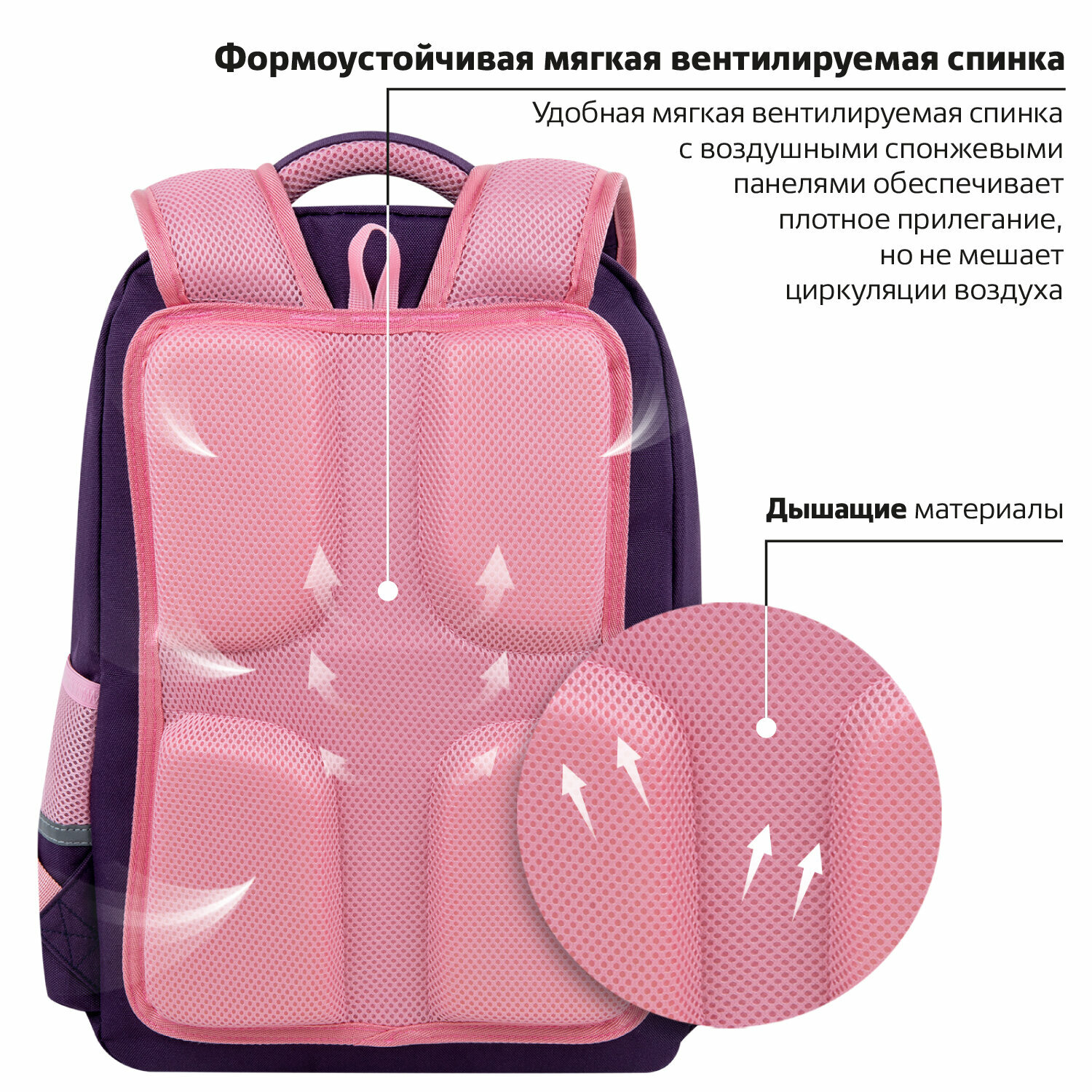 | Особенности | вентилируемая спинка / вентилируемые лямки / разделитель в главном отделении / регулируемые лямки / ручка для переноски / с наполнением / светоотражающие элементы / эргономичная спинка |