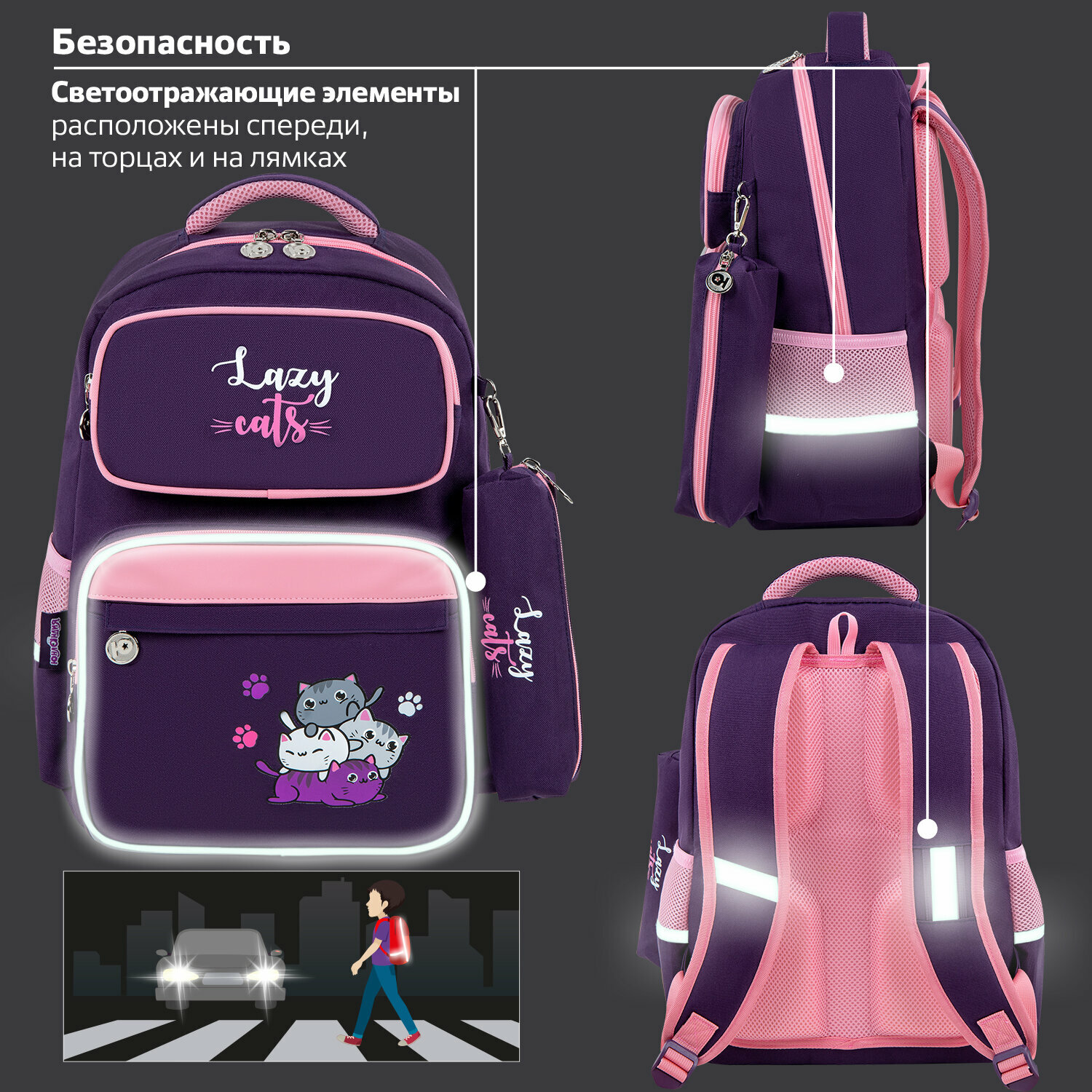 Отзывы на Рюкзак школьный для девочки, ранец для подростка спортивный, портфель детский в школу, эрго спинка, набор с пеналом, Юнландия Cat pile, 272056
