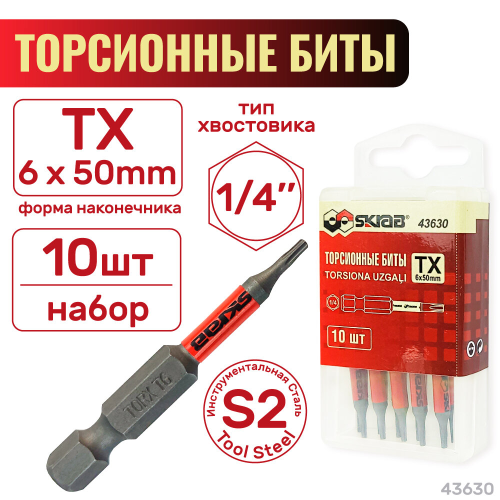 10 цен на Биты торсионные T 6 x 50 мм 10шт. SKRAB красные 43630