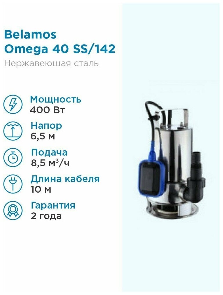 Отзывы на Насос дренажный Belamos Omega 40 SS - 0,40 кВт (1x230 В, Hmax 6,5 м, Qmax 142 л/мин, кабель 10м)