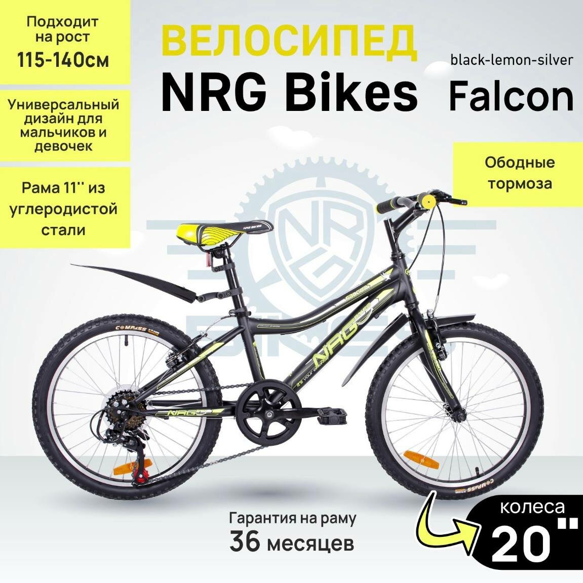 Горный Велосипед NRG Bikes FALCON 20''/11'' black-lemon-silver, 7 скоростей, 2022 год