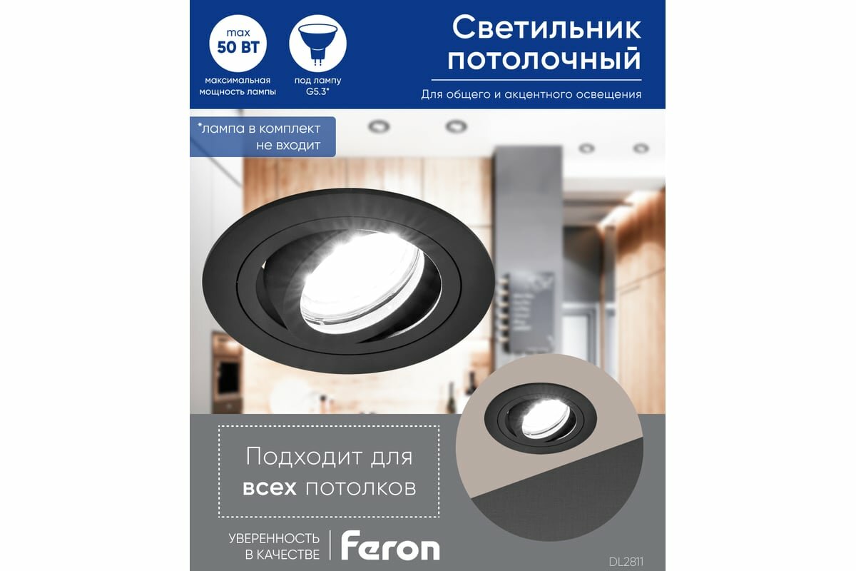 Светильник потолочный встраиваемый, светодиодный, под сменяемую лампу FERON DL2801, 50Вт, MR16, G5.3, черный 568 ₽