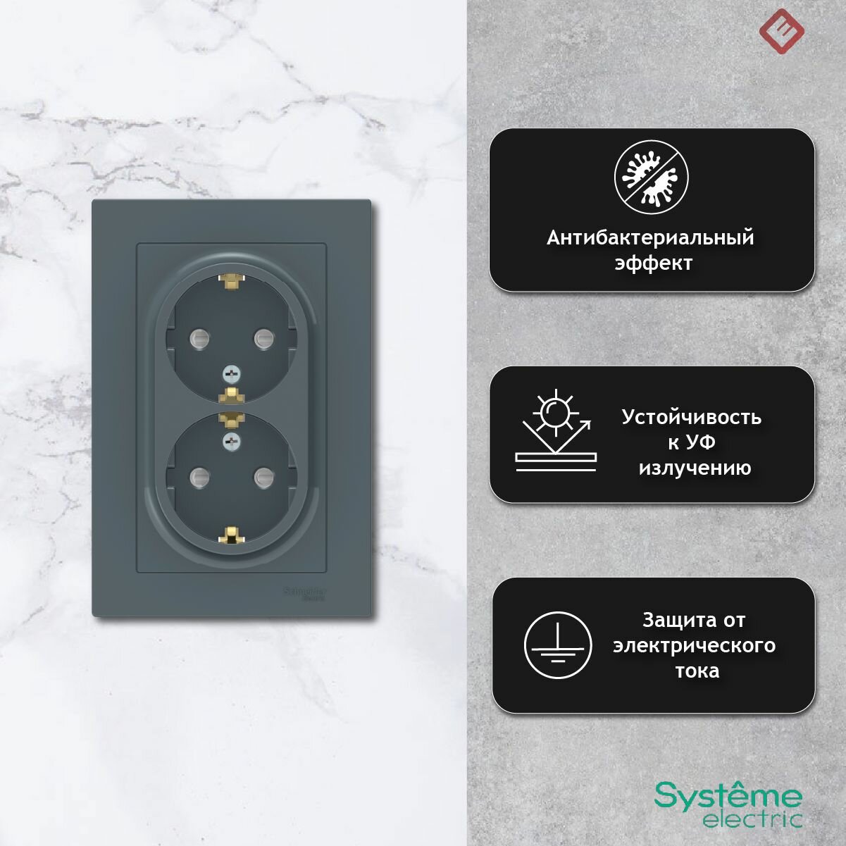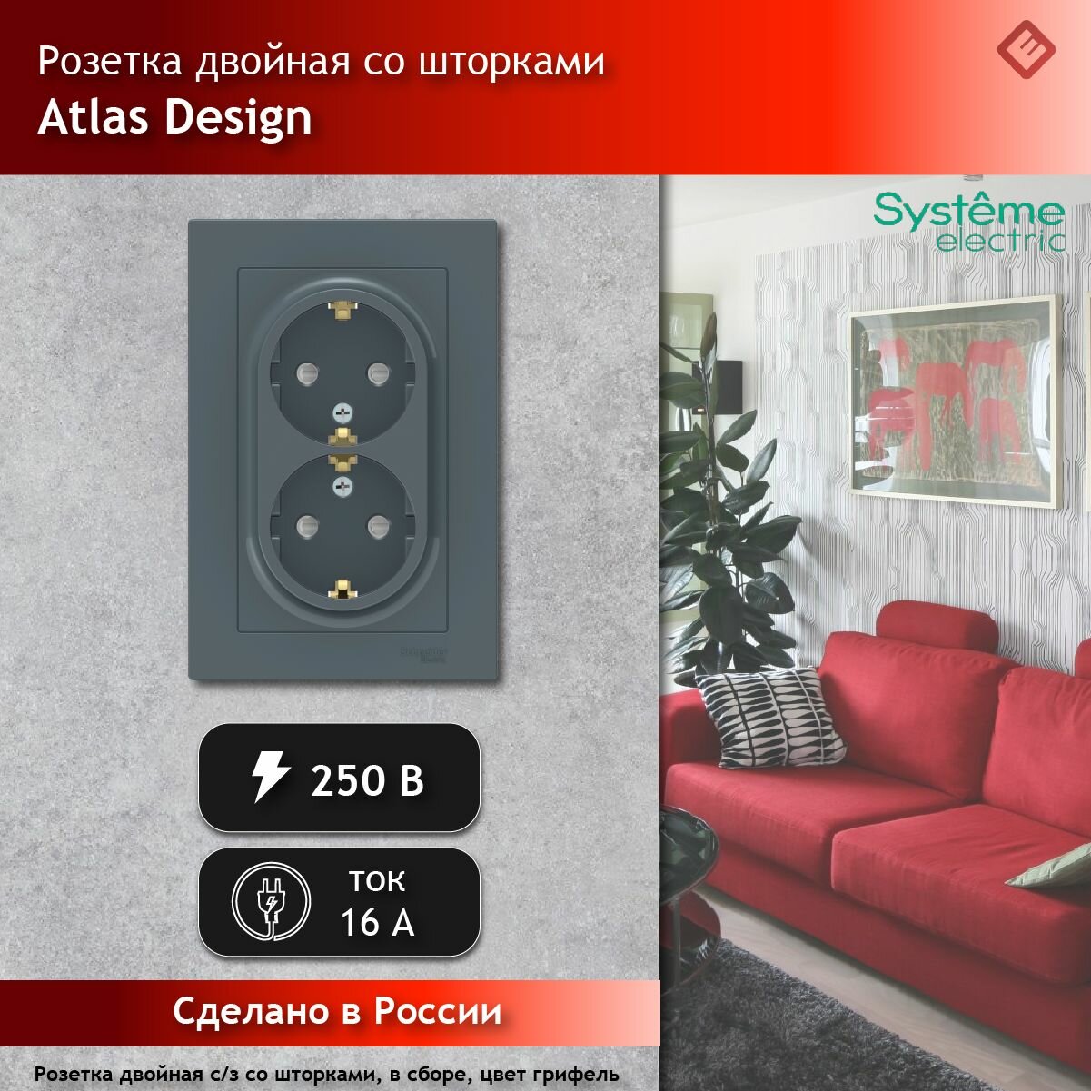 Отзывы на SE AtlasDesign Грифель Розетка с/з двойная, со шторками, 16А, в сборе (комплект 2шт)