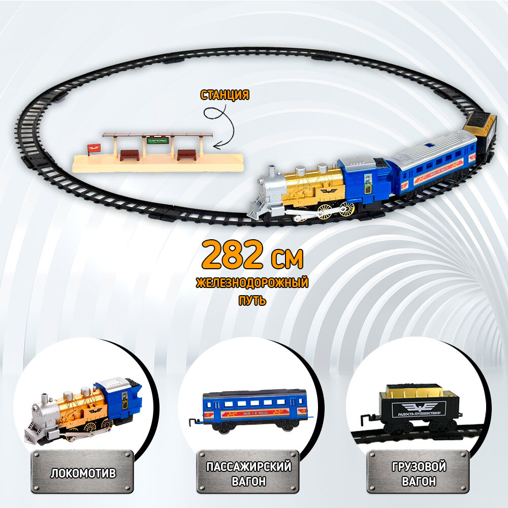 Детская железная дорога с поездом Classic Train, 15 элементов, размер дороги 100х100 см, поезд, 2 вагона, дым, светящийся прожектор, звук