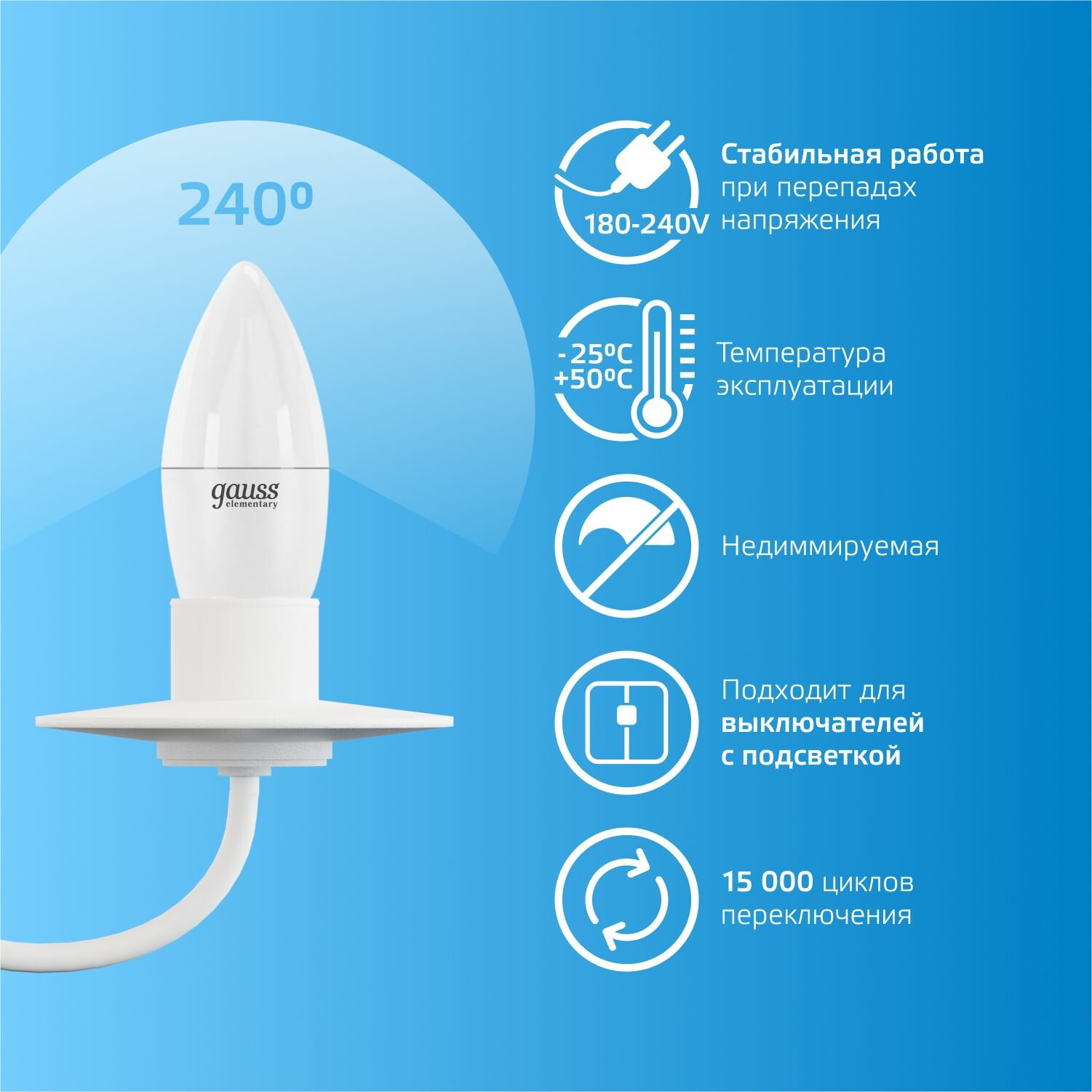 Лампочка светодиодная E27 Свеча 6W нейтр-белый свет 4100K упаковка 10 шт. Gauss Elementary 1 456 ₽